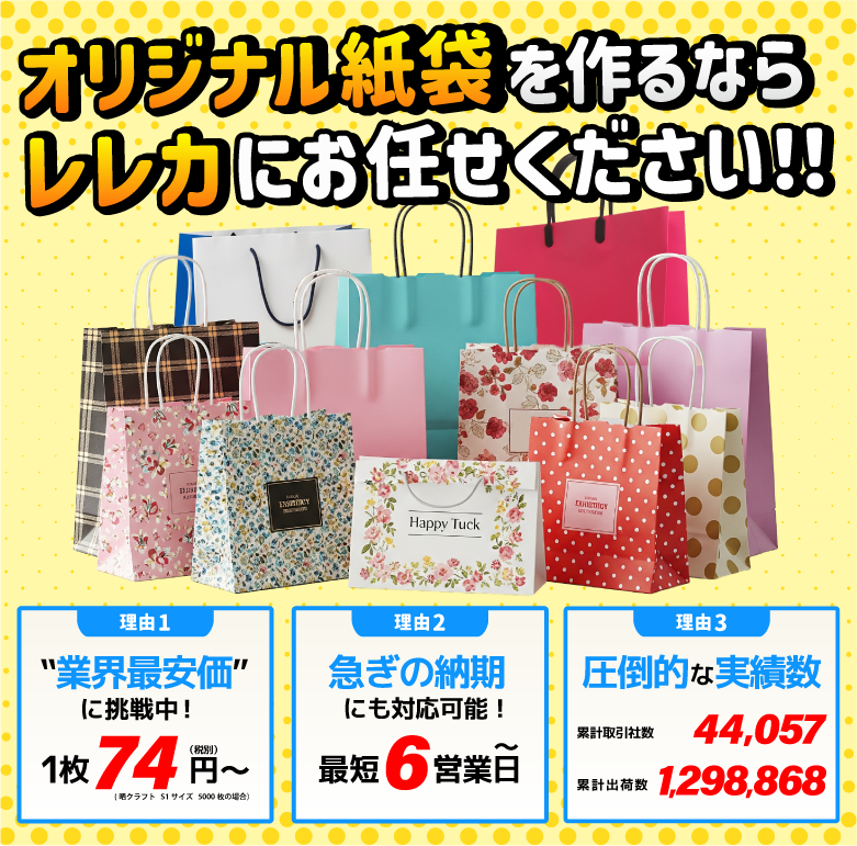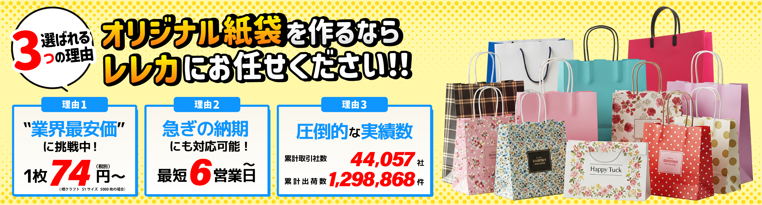 コスト削減をお考えのお客様、納期をお急ぎのお客様、特殊な紙袋を作成したいお客様はぜひ一度レレカにご相談ください。